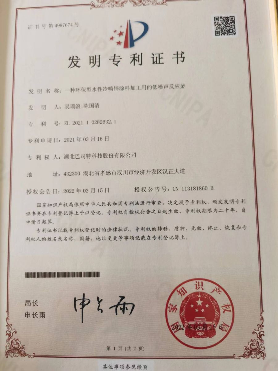 熱烈祝賀湖北巴司特科技股份有限公司于2022年新獲《一種環(huán)保型水性無機(jī)硅改性樹脂涂料的制備方法》、《一種無機(jī)硅改性礦物涂料的制備方法》、《一種無機(jī)雜化改性醇酸涂料的制備方法》、《一種環(huán)保型水性冷噴鋅涂料加工用的低噪聲反應(yīng)釜》、《一種無機(jī)雜化改性丙烯酸涂料的制備方法》5項(xiàng)發(fā)明專利證書。