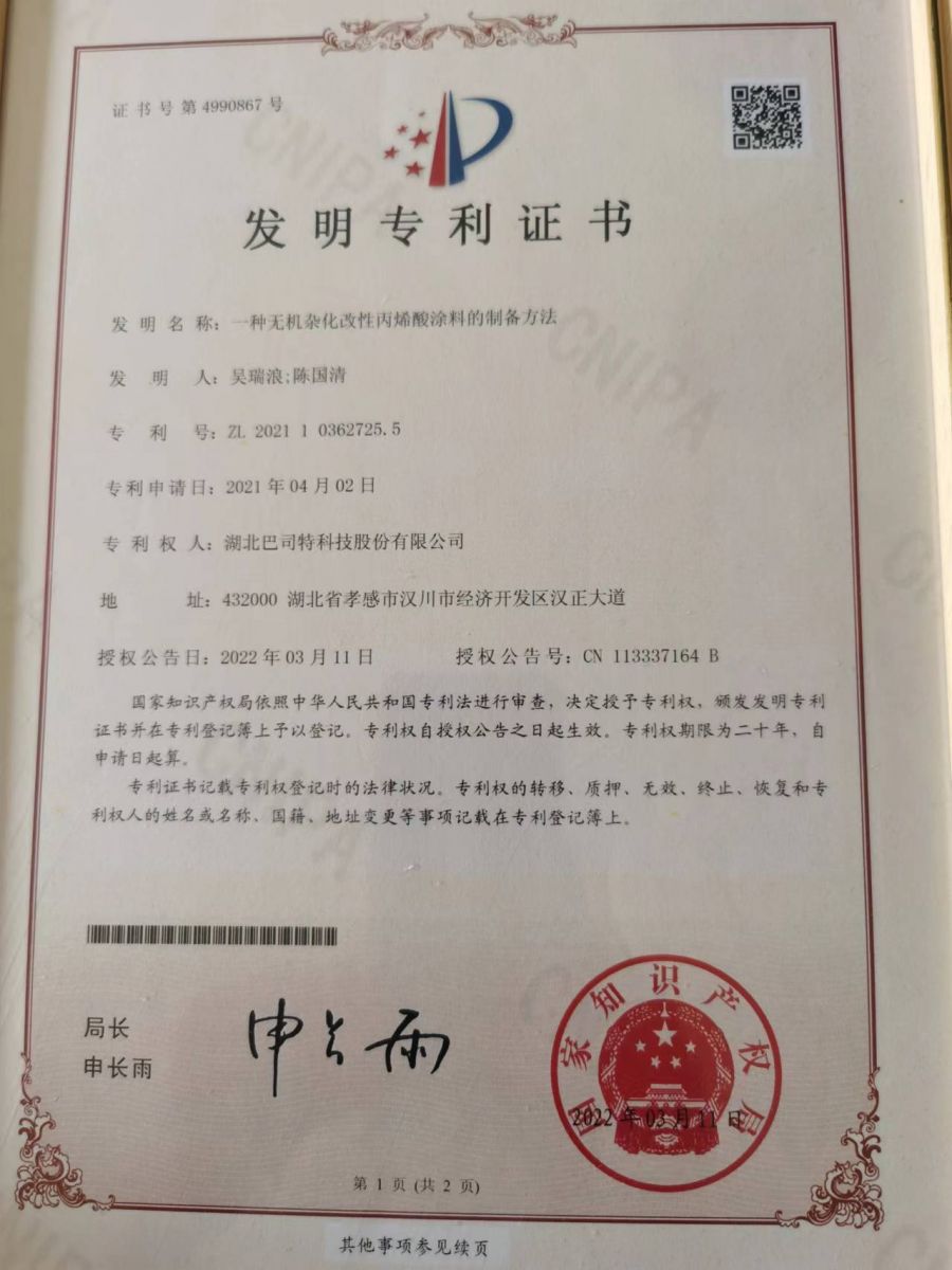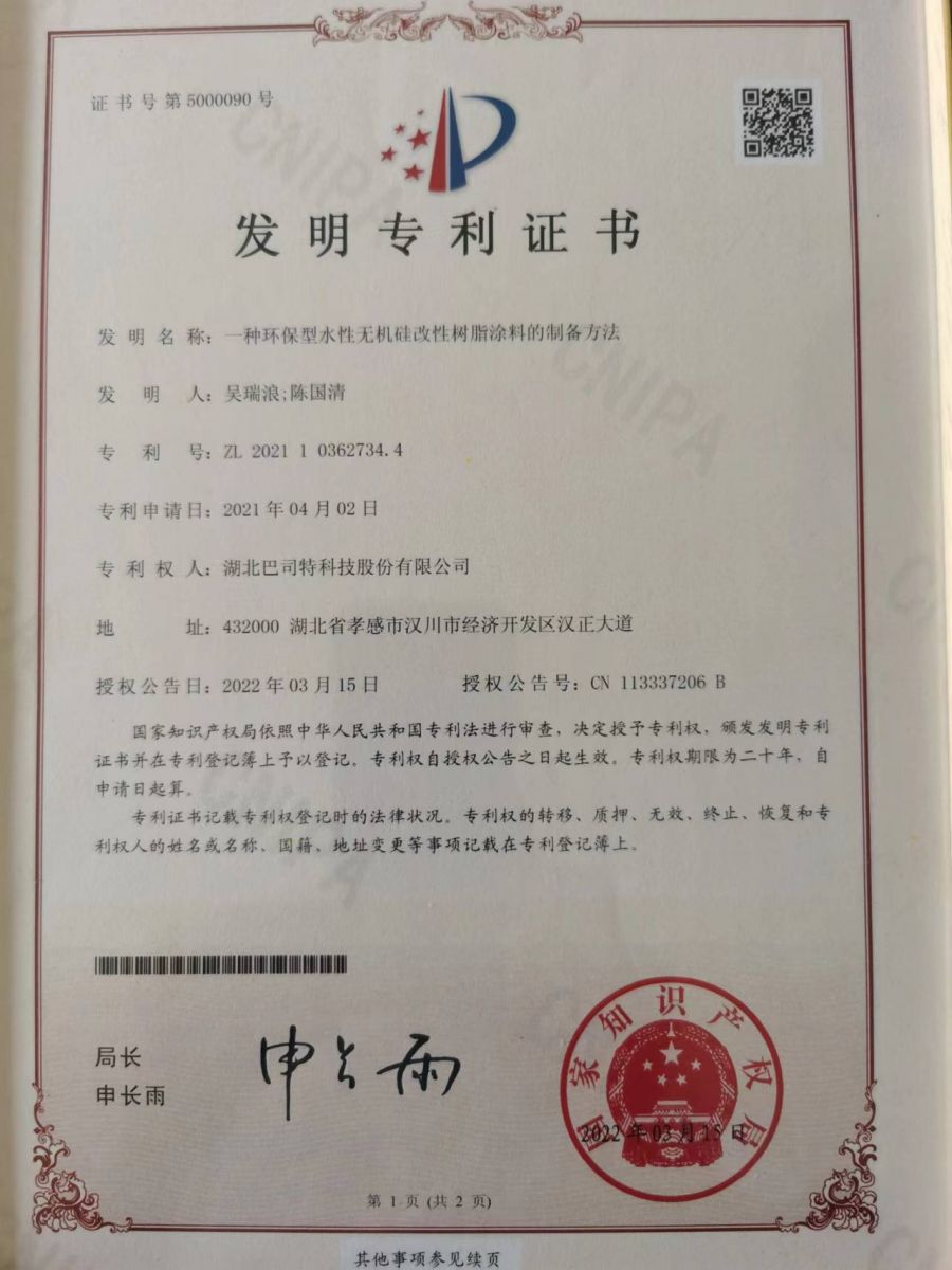 熱烈祝賀湖北巴司特科技股份有限公司于2022年新獲《一種環(huán)保型水性無機(jī)硅改性樹脂涂料的制備方法》、《一種無機(jī)硅改性礦物涂料的制備方法》、《一種無機(jī)雜化改性醇酸涂料的制備方法》、《一種環(huán)保型水性冷噴鋅涂料加工用的低噪聲反應(yīng)釜》、《一種無機(jī)雜化改性丙烯酸涂料的制備方法》5項(xiàng)發(fā)明專利證書。
